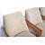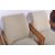 A matching set of four retro 20th Century South African teak framed dining / side lounge chairs having beige woollen fabric upholstery to the sweeping seat and backrest with cushioned seat pads. Each having a squared teak frame supports with a central support and back leg united by stretchers. Characteristics of Frank Lloyd Wright. Each armchair / carver measures approx; 85cm x 52cm x 62cm.