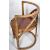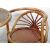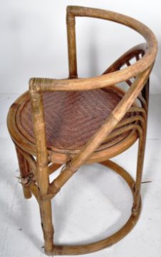 A retro vintage 20th Century 1980's bamboo and wicker two person dining / breakfast table having a elongated oval top with rectangular side panel supports with fan decoration united by central curved stretchers. Two chairs of curved circular form that slot in to each end. Wear commensurate with age. Table measures approx; 75cm x 101cm x 54cm.