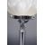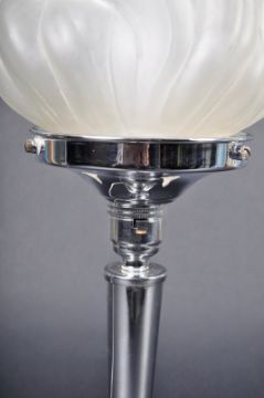 A vintage 20th Century Art Deco chrome table lamp light having a torch flame glass shade atop the chrome tapering stem. All raised on a circular weighted base. Measures approx; 47cm x 17cm diameter.