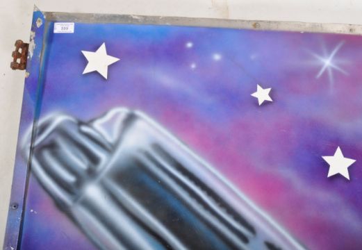Men In Black - Two large 1990's / 2000's fairground / funfair / amusement park painted panels with purple and blue tones with each decorated with Men In Black members. One with Will Smith and the other Tommy Lee Jones. Mounting brackets to each. Each measures approx; 79cm x 132cm.