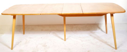 Lucian Ercolani - Ercol - Grand Plank - A large retro vintage mid 20th Century beech and elm extending dining table having an elm rounded edge rectangular top with extending leaves stored within. All raised on beech tapering splayed supports with central extra leg. The Grand Plank table comes with two part hinged leaf. Good condition throughout. When closed measures approx; 72cm x 152cm x 90cm. Fully extended measures approx; 72cm x 220cm x 90cm.