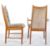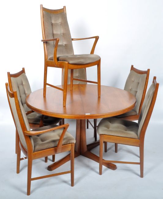 Edward Valentinsen (Manner of) - A retro vintage 1960's Danish Scandinavian teak wood extending dining table of rounded form raised on four splayed legs. Complete with a spare leaf. Together with a matching set of six dining chairs (two being carver armchairs) having teak frames with button backed beige upholstery raised on cylindrical tapering supports. Unmarked. Table measures approx when closed; 76cm x 125cm diameter. Carver chairs measure approx; 95cm x 56cm x 50cm.