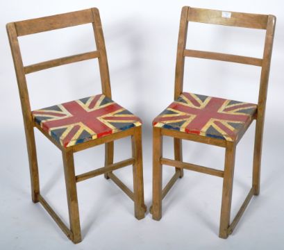 A matching pair of vintage 20th Century 1940's / 50's oak school chairs having a rail backrest with Union Jack painted seats. Each raised on straight leg supports united by stretchers. Each measures approx; 82cm x 40cm x 35cm.