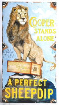 Copper's Dipping Powder - A contemporary oil on board artist's impression painting of a traditional advertising enamel sign. The sign featuring a lion standing upon a box of Coppers Dip with yellow lettering reading 'Copper Stands Alone, A Perfect Sheepdip'. Measures approx; 80cm x 44cm.