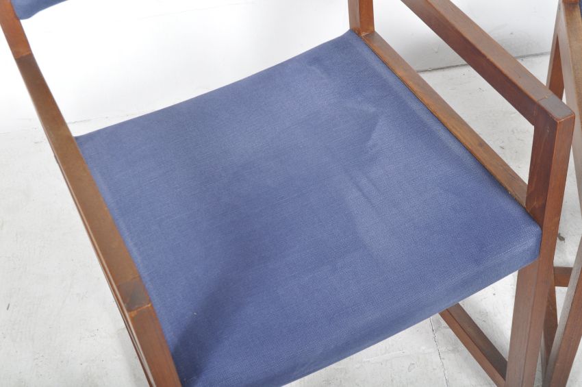 Guy Rogers - A pair of retro mid 20th Century Cubist teak framed dining carver chairs / office armchairs of squared form having blue wool upholstered curved backrest and padded seat. Teak show wood frame raised on square supports united by a single stretcher. Each measures approx; 81cm x 50cm x 48cm.