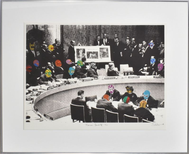 Static (British, b.1983) Mexican Standoff, 2009 Screen print on 300gsm Fabriano paper  Signed, titled and numbered 23/75 in pen, with the artist’s blind stamp 70 x 82 cm (27 x 32 in) STATIC is the creative output of East London based artists Tom and Craig, who have been working as one since 2006. The combination of their backgrounds in Graphics and Fine Art allows for their collaborations to create an award-winning aesthetic that fuses elements of urban art with fine art, merging a clean graphic style with stencils, spray paint, screen printing and paint brushes to create unique pieces which have been exhibited on the streets of London as well as a number of international gallery spaces. STATIC established their studio in 2006 and have been printing, painting and pasting all their own work to maintain a consistency of output and directly influence the decision-making processes that go into each idea, original artwork and edition they produce. This lot is also sold subject to Artists Resale Rights, details of which can be found in our Terms and Conditions.