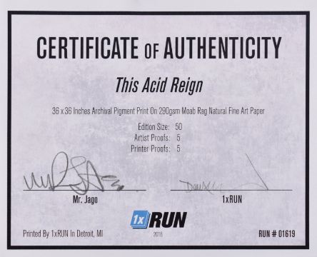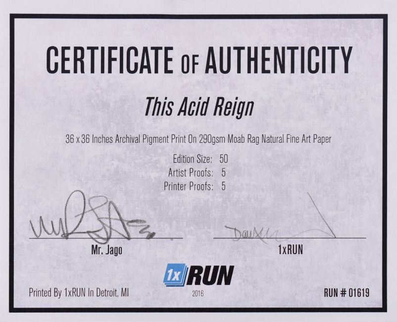 Mr Jago (British, b.1972)This Acid Reign, 2015Archival pigment print on 290gsm Moab Rag natural fine art paperSigned and numbered 30/50 Published by 1xRun, comes with gallery COA91 x 91 cm (35 x 35 in)Duncan Jago’s career as Mr. Jago began as a formative artist in Bristol’s acclaimed graffiti scene. He initiated the Scrawl movement, a school of street art that elected members based on their abilities with line, movement, and narrative composition. Jago was featured in the seminal, eponymous book Scrawl published in 1999. Having studied illustration at the University of the West of England, Mr. Jago’s style, initially heavily illustrative, has evolved into something far more abstracted and expressive. Mr. Jago has taken spray painting to a level of sophistication rarely seen in the medium; there is maturity and depth to his use of colour which he uses to describe the natural world and the cosmos, as he says:/“A love of nature has been the biggest influence on my work, the forms and flows that exist within it seem to be appearing … more and more nowadays.”/These references to landscape imagery with less emphasis on gesture and brushstrokes, combined with a strong focus on colour and its emotional function, is strongly reminiscent of the mid-century Colour Field movement, pioneered by the Abstract Expressionist Mark Rothko. Mr Jago is also influenced by painters such as Jules Olitski, Dan Christensen and Albert Stadler.This lot is also sold subject to Artists Resale Rights, details of which can be found in our Terms and Conditions.