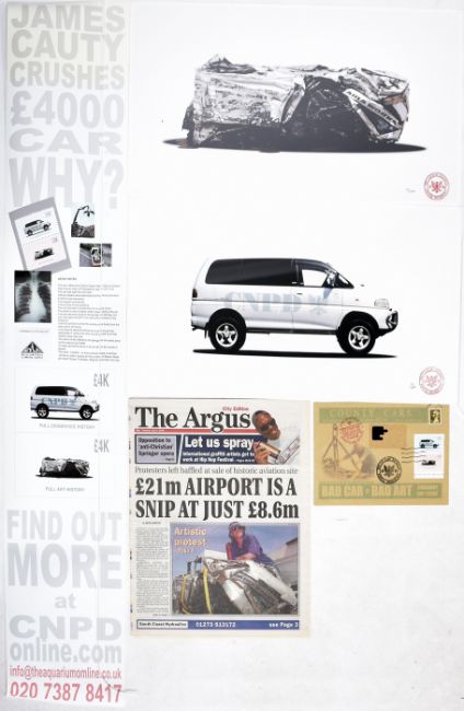 James Cauty (British, b. 1956) Bad Car Bad Art  Set of 2 Pop Edition Giclee prints, with 1st Day Issue Stamps and press release poster Prints signed and numbered 9/100 and 15/100 in black pen 31 x 55.5 cm (12 x 22 in) Over a diverse and productive career Cauty has distinguished himself as a musician, record producer, artist and cultural provocateur through fusions of high art, low art and popularist mediums to spectacular effect. As a teenager Cauty drew the intricate multi-million selling Lord of the Rings poster for British retailer Athena. With Alex Patterson as The Orb and with Bill Drummond as The KLF and the Justified Ancients of Mu Mu, Cauty co-wrote and produced a string of global top ten hits. As The K-Foundation, Cauty and Drummond staged a series of seminal actions including the 1994 K Foundation Art Award for Worst Artist of the Year and the K Foundation Burn A Million Quid. From experimental sonic weapons (the Advanced Acoustic Armaments), to anti-Iraq war postage stamps (Stamps of Mass Destruction), and model making (Riot In A Jam Jar and the Aftermath Dislocation Principle) Cauty’s work combines dissent, cultural subversion and gleeful level of high humour. His roguish and voluble approach has earned him a cult following for work that remains radical, responsive and darkly comical. He produces work that draws on and responds to contemporary culture, sampling it and selling it back as recorded realities. In 2013 Cauty completed The Aftermath Dislocation Principle (ADP), a vast 1:87 scale-model landscape (equivalent to 1 sq mile in miniature) which has been completely looted, destroyed, burnt and is devoid of life apart from 3000 or so model police that attend this apocalyptic aftermath. In 2015 the ADP was installed in Banksy’s Dismaland in Weston Super Mare. This lot is also sold subject to Artists Resale Rights, details of which can be found in our Terms and Conditions.