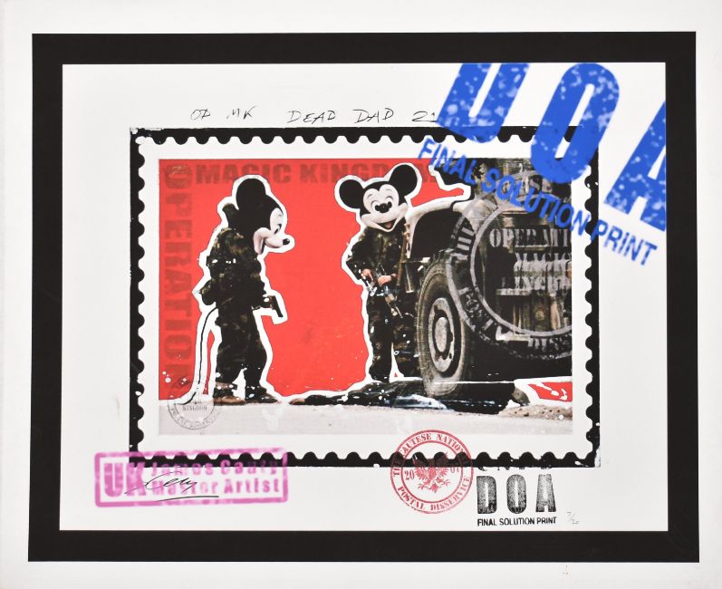 James Cauty (British, b. 1956) Dead Dad 21 Giclee print Signed in plate and numbered 7/20 in pencil 31 x 38 cm (12 x 15 in) Over a diverse and productive career Cauty has distinguished himself as a musician, record producer, artist and cultural provocateur through fusions of high art, low art and popularist mediums to spectacular effect. As a teenager Cauty drew the intricate multi-million selling Lord of the Rings poster for British retailer Athena. With Alex Patterson as The Orb and with Bill Drummond as The KLF and the Justified Ancients of Mu Mu, Cauty co-wrote and produced a string of global top ten hits. As The K-Foundation, Cauty and Drummond staged a series of seminal actions including the 1994 K Foundation Art Award for Worst Artist of the Year and the K Foundation Burn A Million Quid. From experimental sonic weapons (the Advanced Acoustic Armaments), to anti-Iraq war postage stamps (Stamps of Mass Destruction), and model making (Riot In A Jam Jar and the Aftermath Dislocation Principle) Cauty’s work combines dissent, cultural subversion and gleeful level of high humour. His roguish and voluble approach has earned him a cult following for work that remains radical, responsive and darkly comical. He produces work that draws on and responds to contemporary culture, sampling it and selling it back as recoded realities. In 2013 Cauty completed The Aftermath Dislocation Principle (ADP), a vast 1:87 scale-model landscape (equivalent to 1 sq mile in miniature) which has been completely looted, destroyed, burnt and is devoid of life apart from 3000 or so model police that attend this apocalyptic aftermath. In 2015 the ADP was installed in Banksy’s Dismaland in Weston Super Mare. This lot is also sold subject to Artists Resale Rights, details of which can be found in our Terms and Conditions.