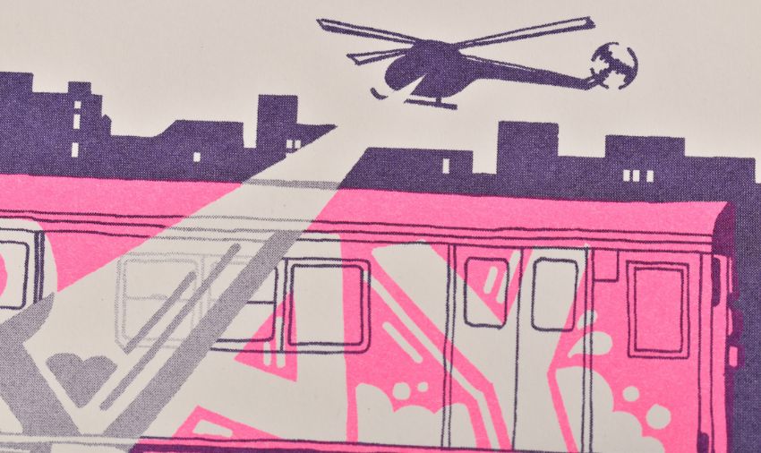 Ermsy Erms (British) Spray and Pray, 2012 Screen Print Signed and numbered 28/30 in pencil 29 x 42 cm (11 x 16 in) Ermsy aka Ermone is English graffiti artist and graphic designer, now living and working in Paris. Beginning graffiti in 1991, he's been painting walls across the globe ever since, in countries such as Colombia, Brazil, Argentina, Australia, Canada and many more.  After several successful gallery shows and commissions, Erms continues to produce illustrations, canvas and prints, as well as continuing to work in the city streets.  Erms paints for graffiti crews FMB (UK), PBG (Lithuanie) and TT (Paris). This lot is also sold subject to Artists Resale Rights, details of which can be found in our Terms and Conditions.