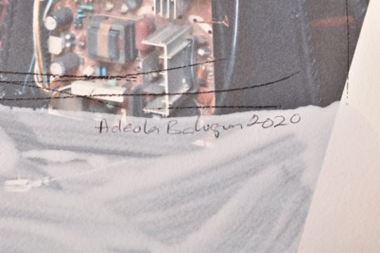 Adeola Balogun (Nigerian b.1966) Gyration, 2020Mixed media on cardboard paperSigned on front with black pen. Title and date on verso76 x 56 cm (30 x 22 in)Born in 1966 in Ogun State, Adeola Balogun is one of the most exciting artist working in Nigeria today. He belongs to an exceptional generation of artists firmly establishing themselves on the Lagos exhibition circuit with their embrace of unconventional media and techniques, and their interrogation of the larger society.This lot is also sold subject to Artists Resale Rights, details of which can be found in our Terms and Conditions.