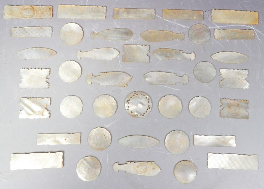 A collection of approx 40x 19th Century Chinese hand carved mother of pearl gaming pieces / counters or tokens. Comprises circular examples, pierced examples, fish, serpentine edge rectangular examples, and more. Largest measures approx; 6.5cm long.