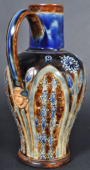 A 19th Century Royal Doulton Lambeth stoneware mask head ewer jug having a lipped pouring spout with cobalt ground neck and applied mask. The body decorated in tubelined flowers and leaf shaped panels. Impressed marks to base with 1879. Measures approx; 20cm tall. Good condition some hairlines to glaze / crazing. Measures approx; 19cm tall.