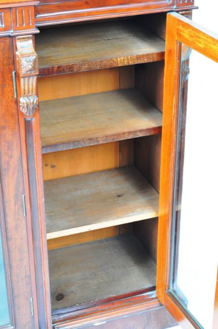 An large 19th Century Victorian mahogany breakfront library bookcase cabinet having and arched back rail over a chamfered edge top. Below a decorative carved frieze with flower head carved decoration with a central protruding double glazed door section with adjustable shelves within. The central cabinet flanked by further glazed door components to each side with all being raised on a plinth base Measures approx; 131cm x 160cm x 47cm.