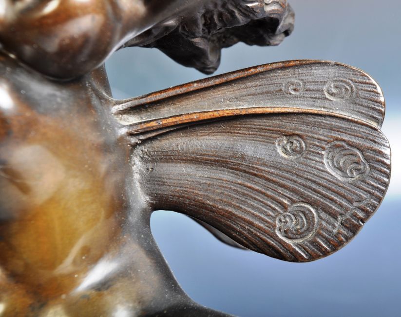 A 19th Century large bronze figurine of a cherub putti. The figure depicted in flight holding a laurel wreath with detailed facial features. Raised on a cloud and set to an domed circular base. Measures approx; 28cm tall.
