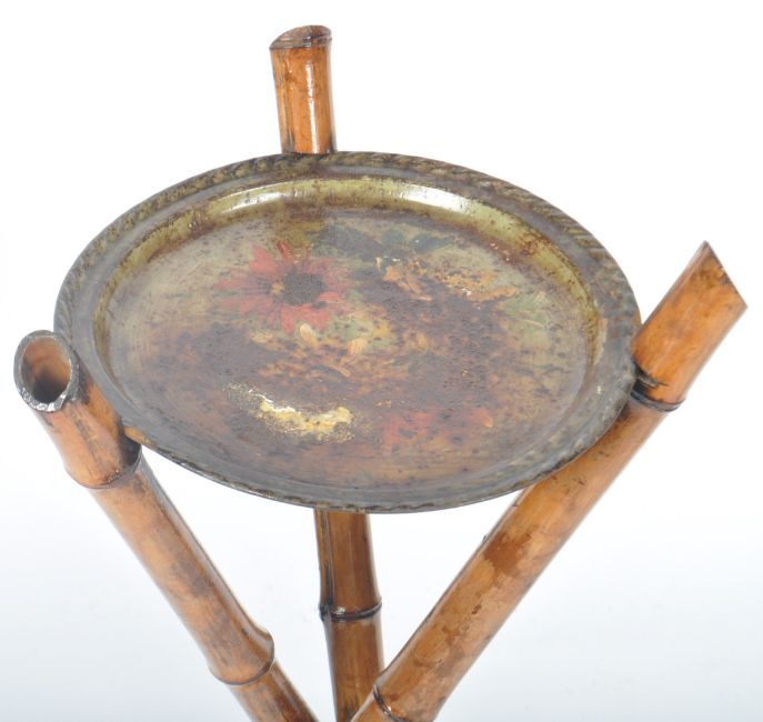 A matching pair of 19th Century Victorian Aesthetic Movement bamboo stands having hand painted circular tin dics tops with floral detailing. The bamboo supports of X-frame form united by lower bamboo stretchers. Wear commensurate with age mostly to the tin painted tops, overall good examples. Each measures approx; 90cm x tall.