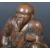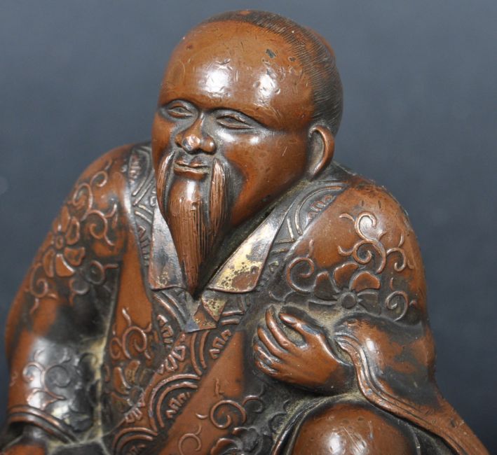 A 19th Century Chinese bronze / bronzed metal figurine or scroll weight depicting a seated elder / immortal. The male figure modelled in a seated position with hair in bun and wearing a robe decorated with scrolls and flowers. Measures approx; 6.5cm x 6cm.