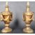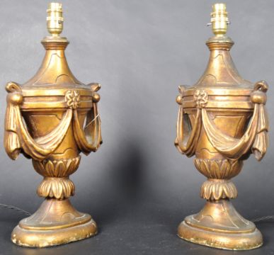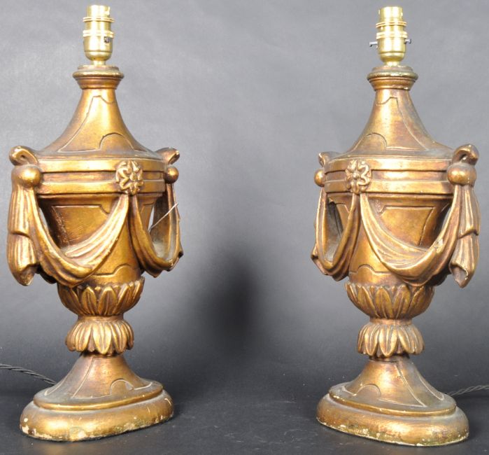 A matching pair of 20th Century 1930's Art Deco gilt resin table lamp lights each of urn shape form with square shaped shades. Each with engraved decoration raised on circular bases. Both sold as untested. Each measures approx; 37cm x 30cm.