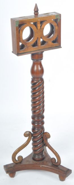 A 19th Century mahogany duet music stand / twin lectern having a metamorphic folding top raised on turned stem with bulbous section raised on triform base with scroll supports. Measures approx; 119cm x 43cm.