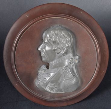 An early 20th Century pewter portrait image depicting Lord Admiral Nelson. The image cast from pewter and mounted on wooden stand. Made by a serviceman in the Navy in the 1920's.