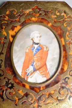 An 18th Century large size portrait miniature on ivory study painting depicting General Sir Charles Stewart (1753-1801). Depicts Stewart in full military dress jacket and white curled wig. The portrait set within a boulle work brass and tortoiseshell frame. Label to verso. Measures approx; 19cm x 17cm.