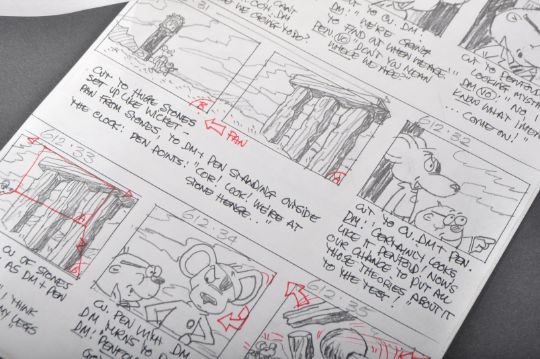 Danger Mouse (1981) - Cosgrove Hall Films - an original hand drawn master set of storyboards for the Series 6 episode The Hickory Dickory Dock Dilemma. Pages 1 to 22 inclusive, hand drawn in pencil with ink notes and later red amendments in some places. A4.