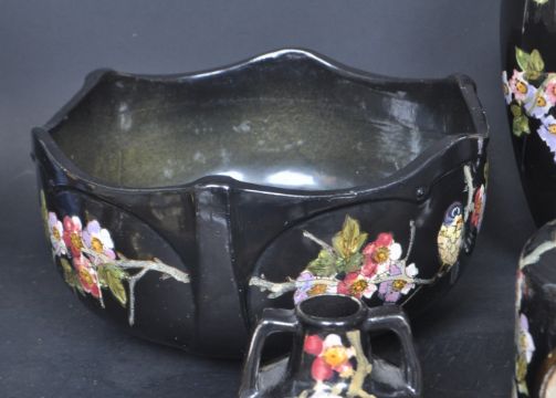 An assortment of Victorian 19th century to include combination cloisonne and copperette vases to include a fruit bowl, vases, pots and a candlestick. Each piece having a black ground with hand painted flower and bird decoration. Measures 24cm tall.