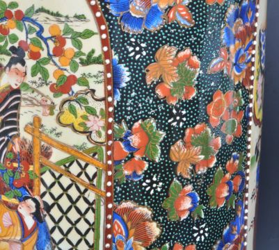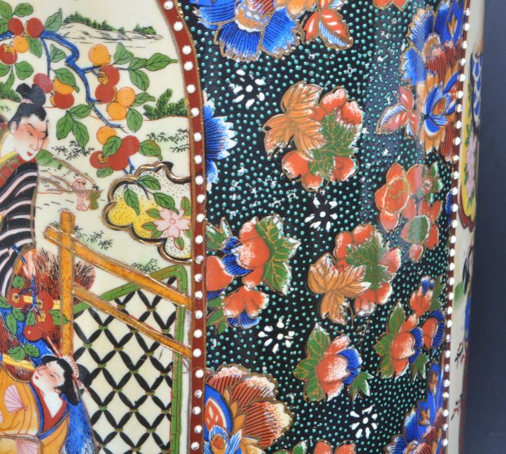 A vintage retro 20th century Japanese ceramic umbrella stick stand pot of cylindrical form hand painted with traditional vignettes and patterns.