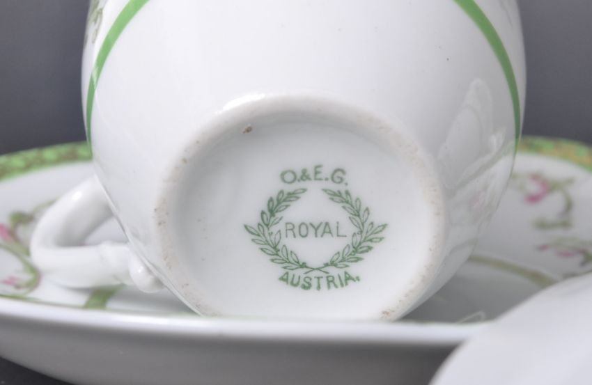 A collection of late 19th century Victorian era Austrian Oscar & Edgar Gutherz Royal Austria bone china teacups and saucers. Each piece having hand painted floral decoration with green and gilt patterning to the rims. The majority of the pieces being marked to the base.