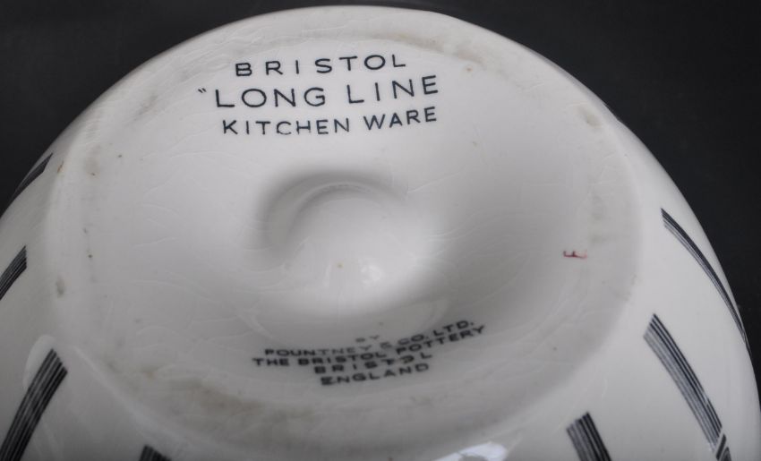 A Bristol Pountney & co Long Line ` Kitchen Ware creamer, together with a early 20th century Grindley Hotelware Tazza centrepiece with a checked rim. The lot also includes 2 toothpaste lids by W. Woods chemist, one universal ointment lid by J. Butcher and a porcelain sugar measurer in white with guilt rim. The tallest object measures approx. 13cm height. The lot appears in overall good condition with minor wears commensurate with age.