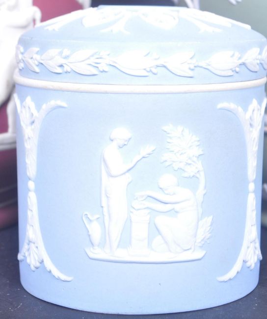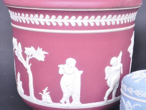 Collection of Wedgwood Jasperware. Including a magenta and sage green planter with a blue vanity box. Tallest measures 18cm.