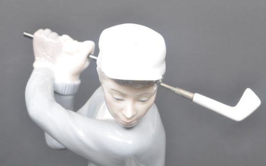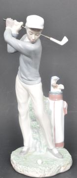 A vintage late 20th century Lladro bone china sculpture of golf player. The subject is in swing position with golf club in his hands and a golf bag on his side. Approx. measures 30cm height. Appears in good conditions.