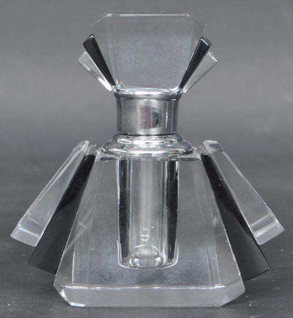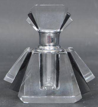 A vintage 20th century Art Deco style flash cut perfume bottle of angular form with stylised stopper. Measures 8cm tall.
