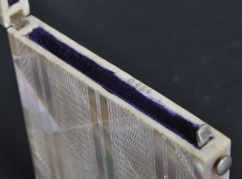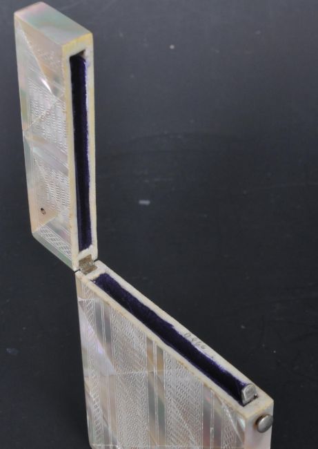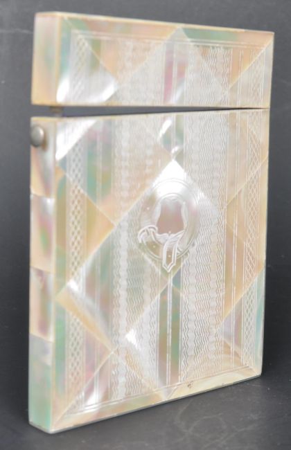 An early 20th century circa. 1900s Edwardian era mother of pearl card case having incised engine turned decoration to the case with armorial motif to the centre. Hinged lid with purple silk lined interior. Measures 10cm x 8cm x 1cm.