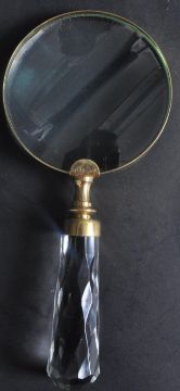 A large vintage 20th century hand held table top magnifying glass having a brass rim with faceted resin handle. Measures 22cm in length.