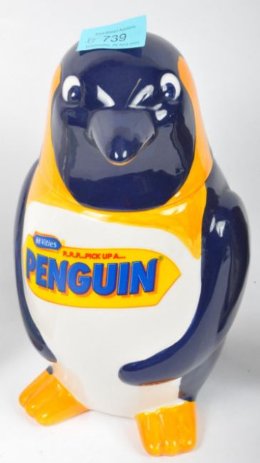A collection of three vintage retro 20th century advertising jars to include a McVities penguin biscuit barrel, a Beans choice whiskey decanter and another.
