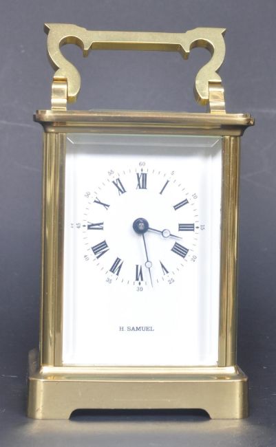 A vintage 20th century H. Samuel carriage 11 jewels clock. The clock having a black face with roman numeral to the chapter ring within a brass case with swan neck handle and bracket base. Marked made in England to the movement.