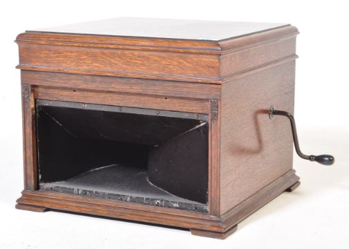 An early 20th century circa. 1930's His Masters Voice HMV oak cased gramophone having a record turntable deck beneath a hinged lid. Measures