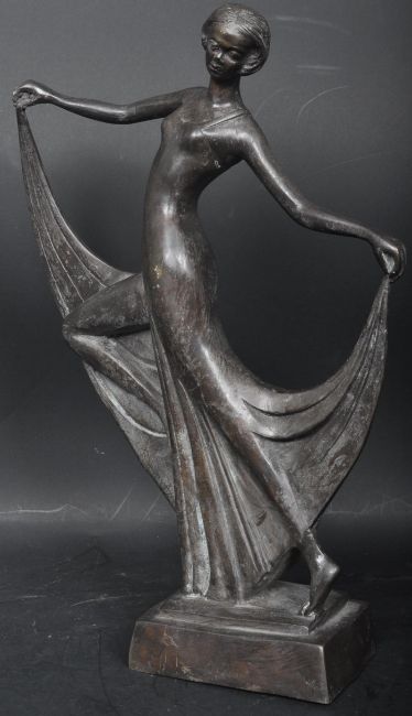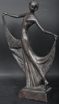 A 20th century Art Deco bronze sculpture figure in the form of a dancer holding the tail ends of her dress. Raised upon a stepped plinth base. Measures 38cm tall.