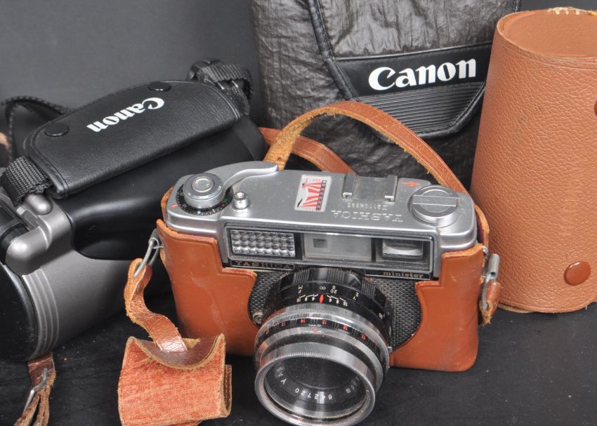 A collection of vintage cameras and equipment to include Yashica Minister with Yashinon 1:2.8 f=4.5cm lens, Nettar Zeiss Ikon, Canon video hand held, cased additional lenses, boxed flash gun