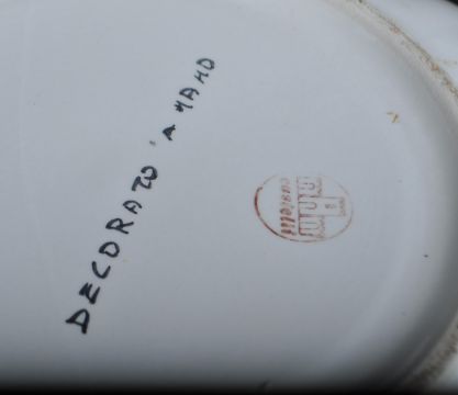 Two pieces of vintage retro 20th century Italian Castelli Pottery to include twin handled vase and large dish plate. Each piece hand painted with florals and marked and stamped to base.