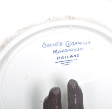 WW2 Dutch Commemorative Plate Herrijzend Nederland celebrating victory in Europe over the Nazis. The plate portrays a triumphant soldier trampling a Nazi flag. Maker marked Societe Ceramique Masstricht, Holland. Measures 23cm