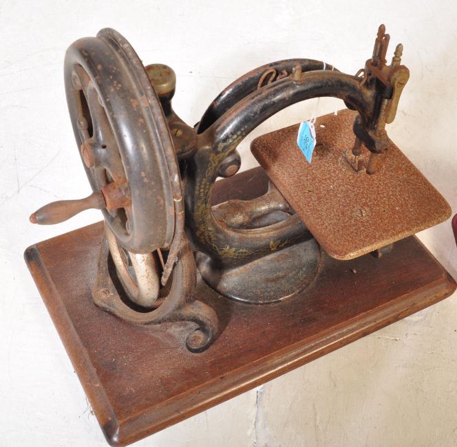 A collection of vintage 20th century sewing machines comprising of a Vulcan Senior, miniature Grain sewing machine, hand crank Singer style sewing machine and more. measures approx: 26cm x 32cm x 21cm