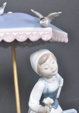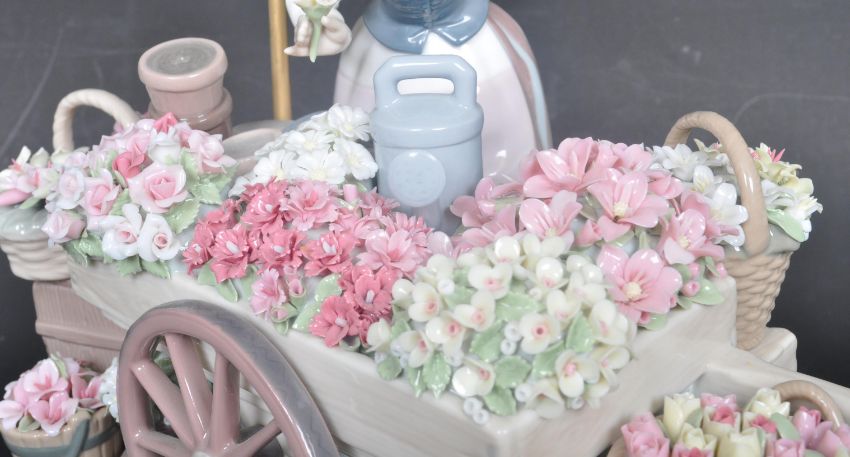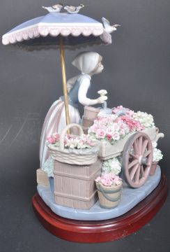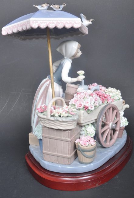 Lladro vintage porcelain sculpture of a woman selling flowers with lots of pots, boxes and baskets full of them, protecting herself from the sun by a large umbrella with birds perched on it. Sculpted by José Puche. Repaired to the handle of the basket behind the flower stall. The rest of the sculpture appears overall in good condition. Approx. measures 30cm height, 27cm width, 18cm length.