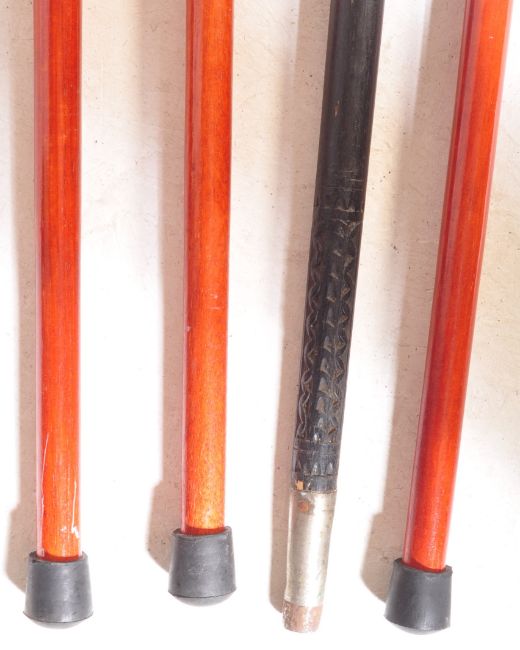 A collection of four vintage 20th century walking sticks. The collection comprises of three having brass zoomorphic handles & malacca shafts together with an ebonised shaft and bone collar