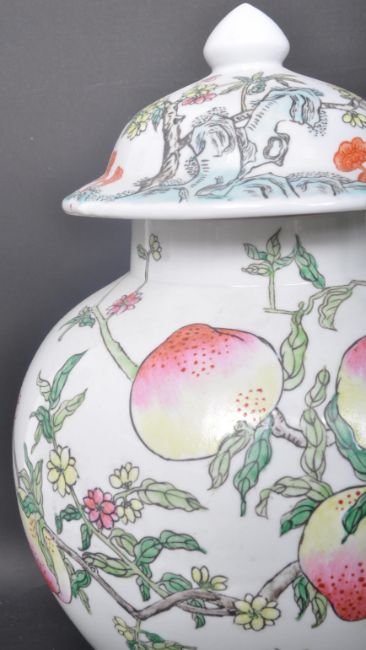 A group of three vintage 20th century Chinese Oriental peach tree porcelain china having comprising of a vase, temple jar & ginger jar. Comes with certificate from the Peking Collection.