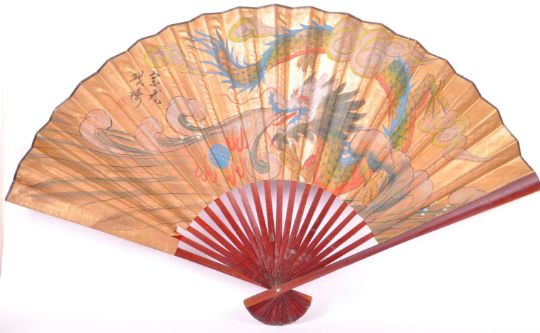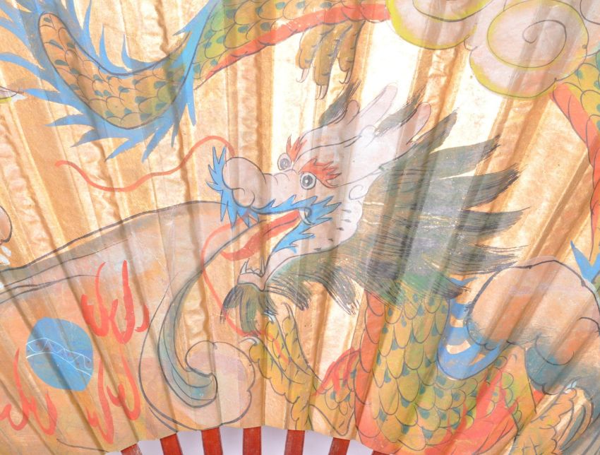 A large vintage 20th century Chinese oriental hand painted and red lacquer wall fan with Chinese dragon decoration. measures approx: 126cm high