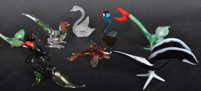 An assortment of retro vintage mid 20th century Murano and similar hand blown glass miniature animal figures to include fish, birds of paradise, frogs, elephants, seals,