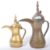 Two early 20th century Persian Arabic brass dallah Qahwa coffee pots in graduating size, each with large curved spout and tall finial atop the lid. measures approx: 41cm high