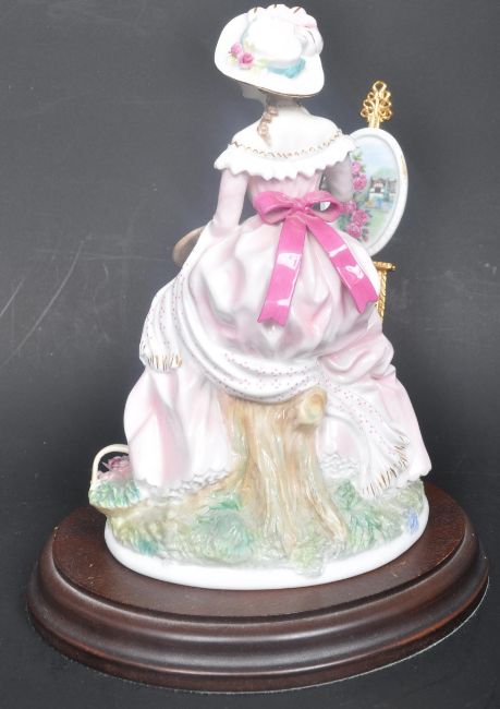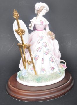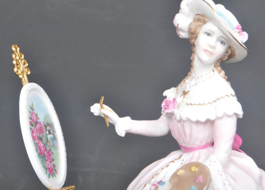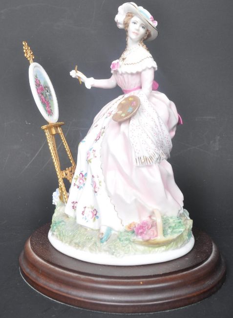 Royal Worcester English limited edition fine bone china figurine "Painting" created as part of "The Graceful Arts", sculpted by Maureen Halson. The sculpture was issued in March 1995. The subject is dressed in a pink traditional summer dress decorated with flowers. She is holding a brush and a colour palette while looking away from the painting in front of her. The sculpture comes with a certificate of authenticity and a wooden base. Measures approx. 26cm height. Appears in overall good conditions, missing the tip of the paintbrush in her hand.